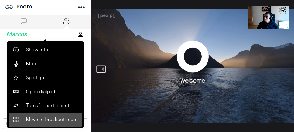 The Breakout Rooms plugin is used by the host of the meeting to move participants to another sub-room. Once the participant is transferred to the sub-room, he can come back to the main room through the roster menu. There are nine sub-rooms per room.